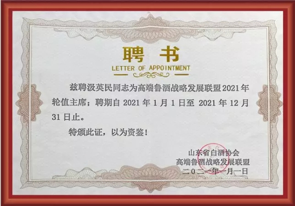 此次“鲁酒战略发展联盟轮值主席”的任命,也是汲英民继2020年10月荣获“首届北方酱酒联盟轮值主席”后又一荣誉。